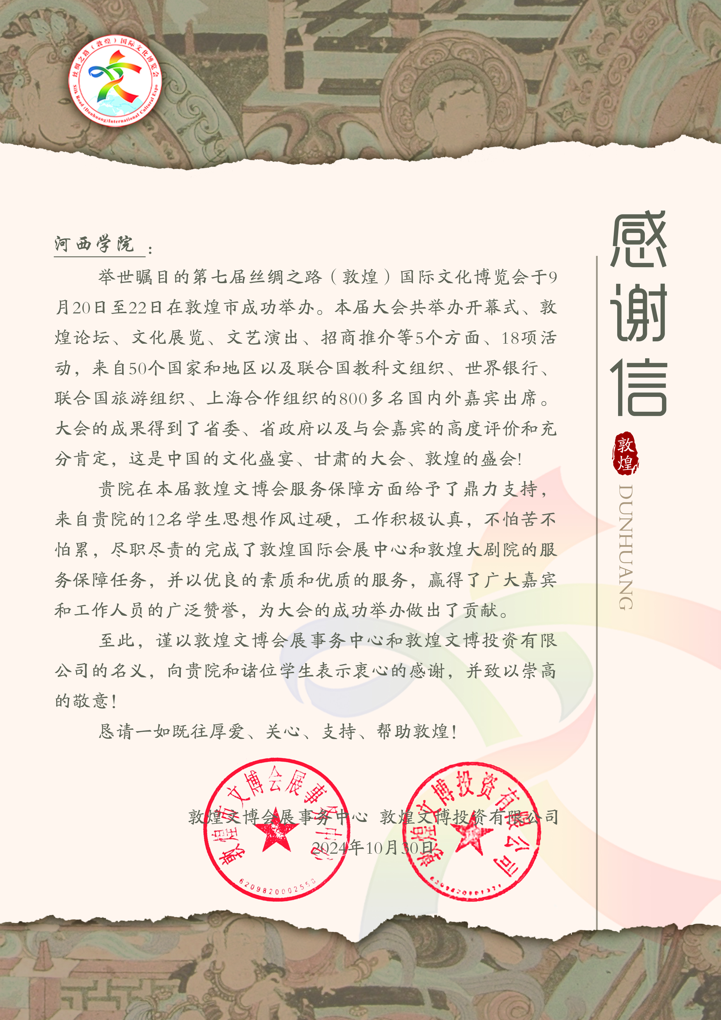 第七届丝绸之路(敦煌)国际文化博览会以“践行全球文明倡议 深化文明交流互鉴”为主题,举办了高规格开幕式、高级别双边多边会见、敦煌论坛、文化展览、文艺演出、招商推介等系列活动。文博会期间,学院学生充分利用所学美术、敦煌美学等专业知识,参与文博会会场布置、现场组织、后勤服务与保障等工作。他们以高度的责任感和奉献精神,赢得了国际友人、甘肃省各界领导、敦煌文博投资有限公司领导和员工的一致赞誉。