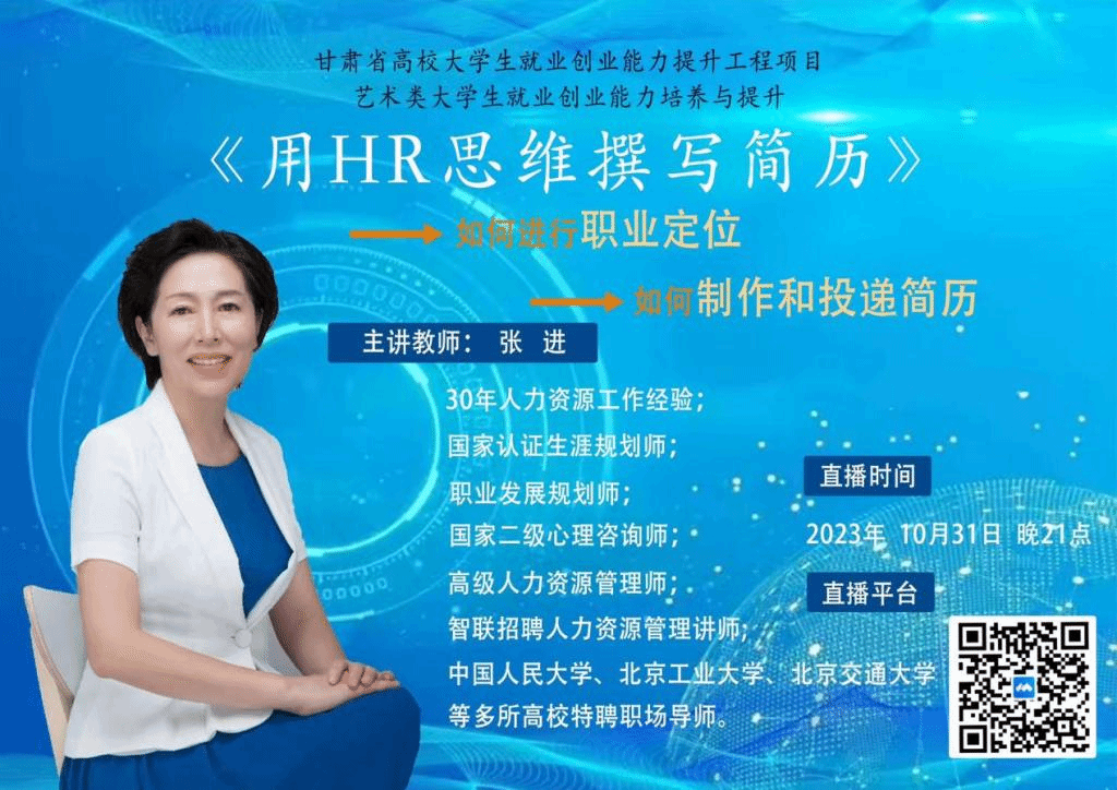 主讲教师:张进(30年人力资源工作经验、国家认证生涯规划师、职业发展规划师、国家二级心理咨询师、高级人力资源管理师、智联招聘人力资源管理师、中国人民大学、北京工业大学、北京交通大学等多所高校特聘职场导师)。