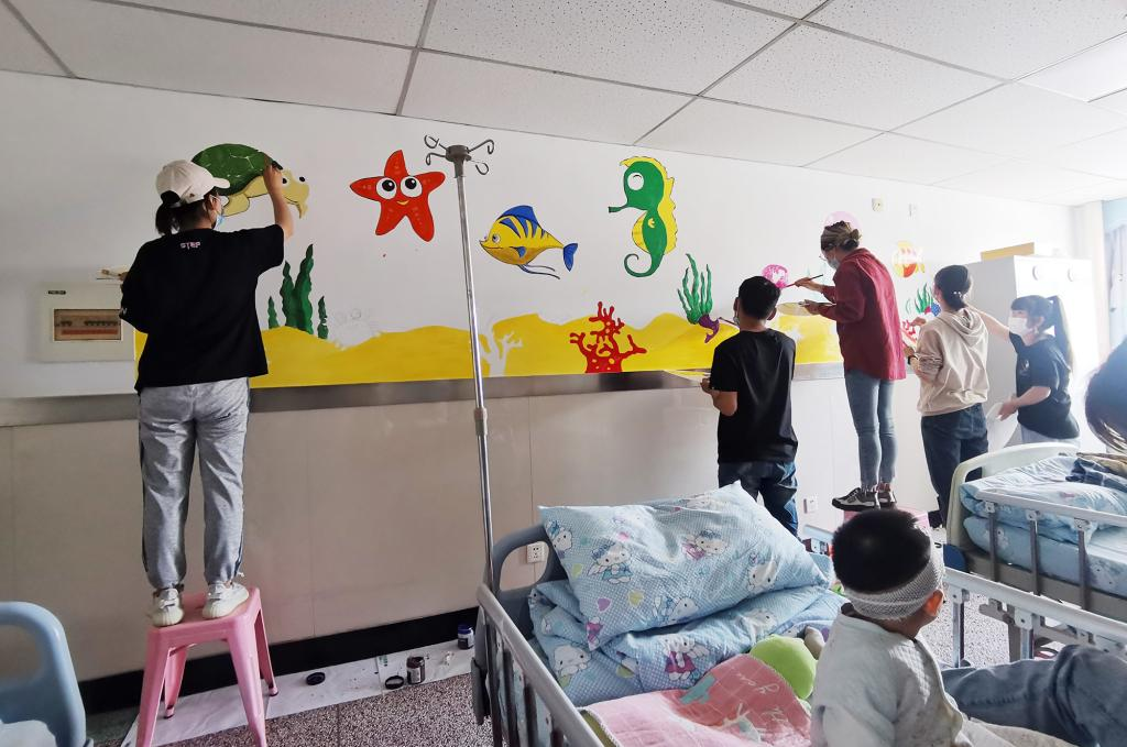 学生党支部在完成墙绘主题设计、颜料选购等前期准备工作后,儿科病房的爱心公益墙绘活动正式启动。学生党员把自己对孩子们的爱、把自己的童心画到墙上,把孩子们害怕的病房变成他们欢喜的天地,使冷冰冰的医疗体验变得温暖且富有人情味,医者愉悦患者康健。