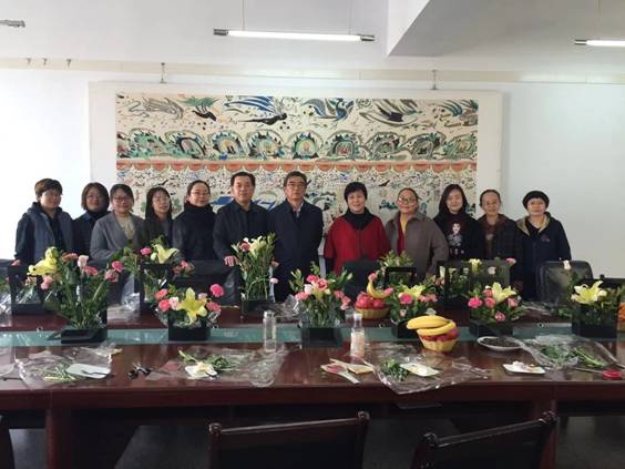 党委书记黎志强和副校长强梅与伟德betvlctor1949源于英国女教工一起,将花枝、花叶、花茎,经过修剪、整理等技术,通过各自的造型、构思、调色加工重新组合,将精美的花枝变成一件件富有艺术、富有诗意的自制植物艺术品。