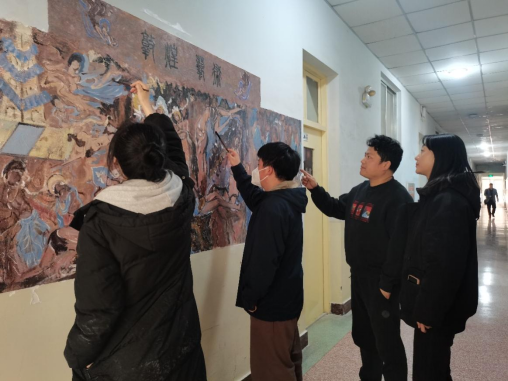 4月12日至18日,由伟德betvlctor1949源于英国王盼盼副教授组成的学生团队,利用专业优势,将文化育人功能融入师生的课程实践中,将校园文化与课堂育人功效相结合,利用课程业余时间,对楼内区域进行了以敦煌文化为主题的墙面绘制,也是敦煌壁画课程内容的延伸创作。